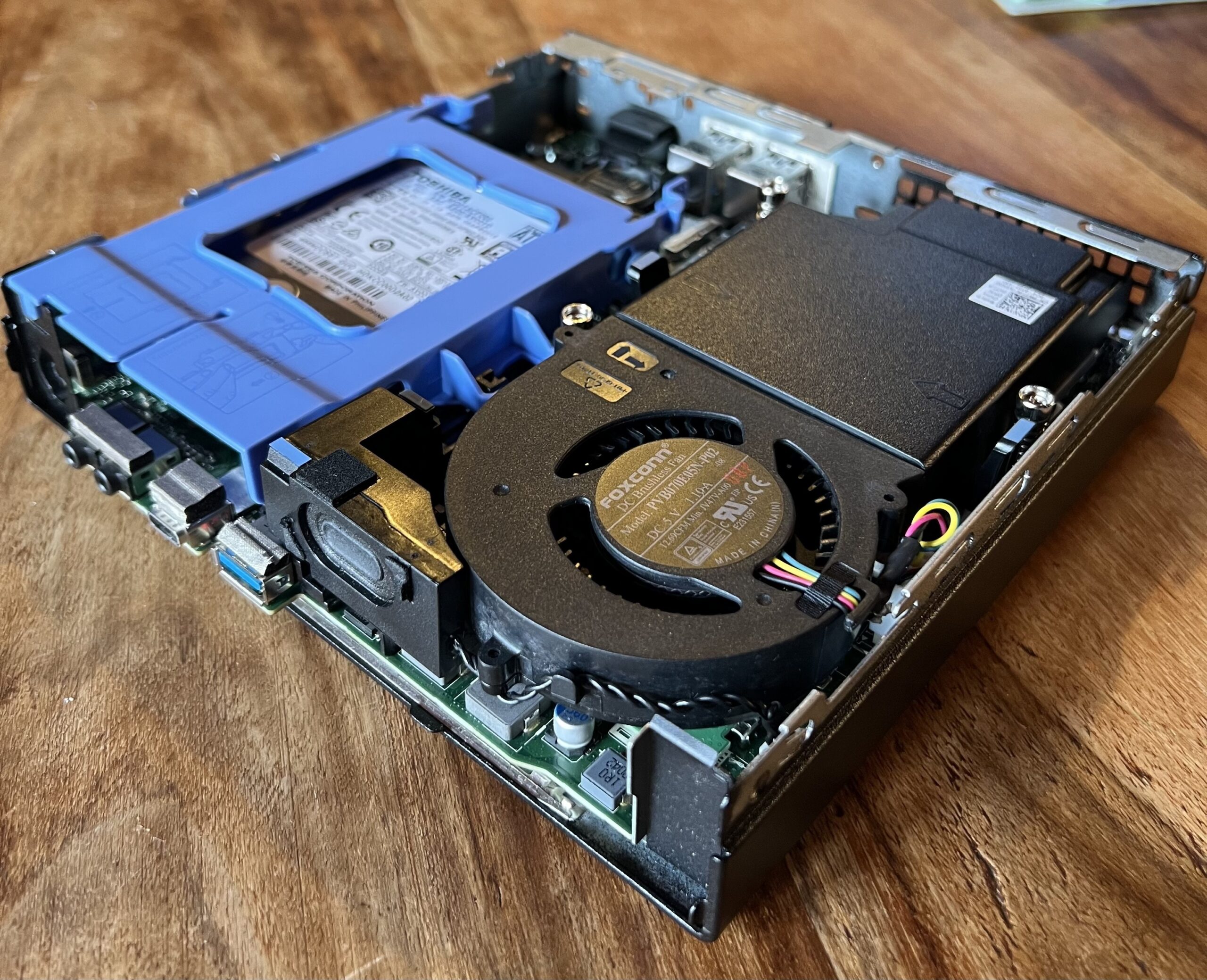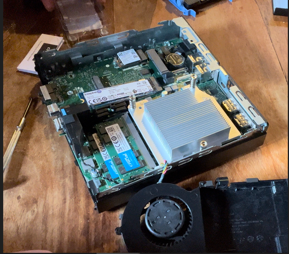 The small black fan pops right out and the RAM can be added. The blue drive caddy is also very easy to remove, and reveals a nvme drive underneath as well as housing the 2.5 SSD.