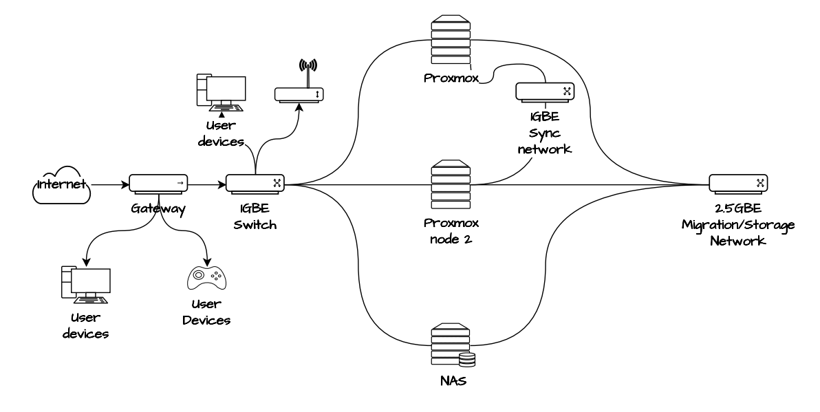 In this post I will document for my own personal information adding a Dell Optiplex 7080 Micro node to my existing Proxmox cluster. The plan is to have a few separate networks, defined on each host and using unmanaged switches for those networks: one dedicated 1GB for the corosync process for clustering the nodes which requires low latency, one for 2.5GB for migration of VM’s on the clusters which requires more bandwidth for faster transfers. Another will be connected to the gateway. The NAS can be connected on a 10GB port of the switch sometime in the future.
