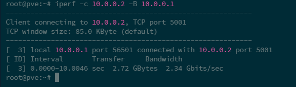 On the client side you make the connection to test, again defining the interface/IP and the test will run; below is a test between proxmox nodes on migration/2.5G network.